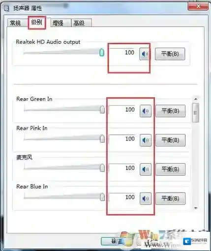 电脑声音很小的解决方法6、在扬声器属性页设置中,有一系列的音量调节设置,其中最上面的那个调节设置跟系统托盘区的音量设置是同步的,可将其调节到最大,然后将下面的那些音量调节通通调到最大。