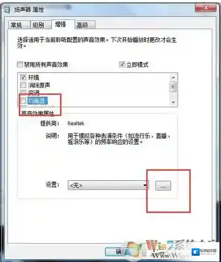 电脑声音很小的解决方法8、在此选项卡下,有一个均衡器的选项,我们可以选定此项,然后再在下面的声音效果属性中,点击设置最右边的三个点的按钮。如图所示。