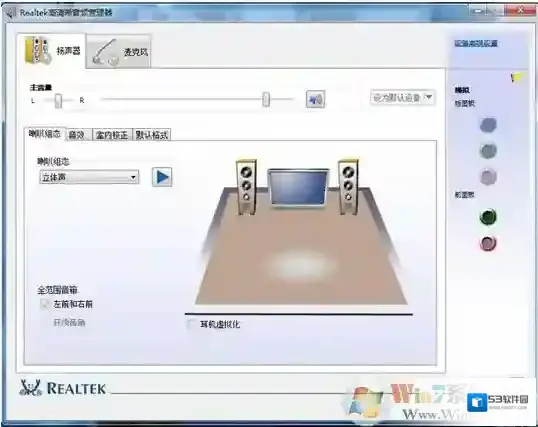 12、打开声卡驱动程序,我们可以看到默认是在扬声器的选项上,下面有一个主音量的调节滑块,默认也不是在最大声上面的,即使将系统托盘上的音量调节到最大,那么声卡也还是有增大声音的潜力的,所以,我们可以通过声卡驱动将其音量潜能发挥到最大,调节到最右端,那么系统的音量会在原来的基础上有一个很大的提升。