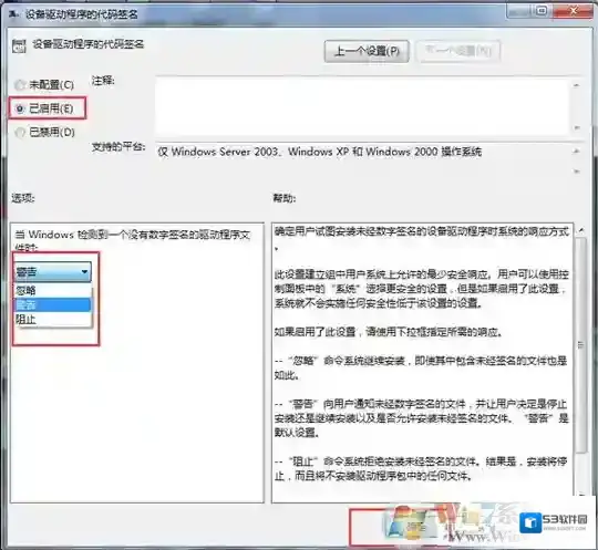 win7系统禁用安装驱动程序需要签名的方法6、在打开的设备驱动的代码签名窗口,我们选择:已启用,在选项的下拉框中,有:警告、阻止、忽略供选择。警告:向用户通知未经数字签名的文件,并让用户决定是停止安装还是继续安装以及是否允许安装未经数字签名的文件。阻止:命令系统拒绝安装未经数字签名的文件。忽略:命令系统继续安装(包括安装未经数字签名的文件)。如果我们要安装未经数字签名的驱动文件,可选择:忽略,再点击:确定;