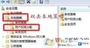 8、在弹出的窗口选择“本地策略”→“用户权限分配”。,如图所示: