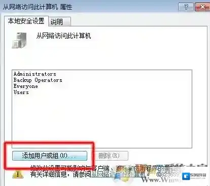9、然后双击打开“从网络访问此计算机”,在弹出的对话框中选择“添加用户或组(u)…”,如图: