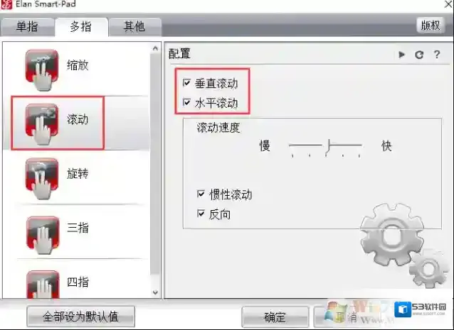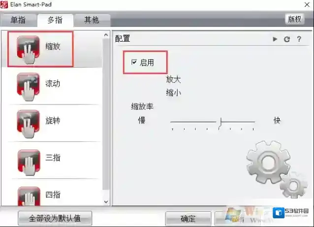 界面二,如下图,须先勾选“多指手势”选项,然后根据需要,分别勾选“双指”、“三指”等选项即可。