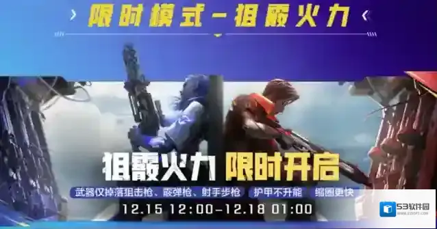 12月15日-18日上线限时模式-狙霞火力,体验狙霞火力模式,完成任务可获得金币*300、能量币*10、B级喷漆-奉冒捉拿*3、光速小子自由灵魂体验卡(3天)*1奖励。