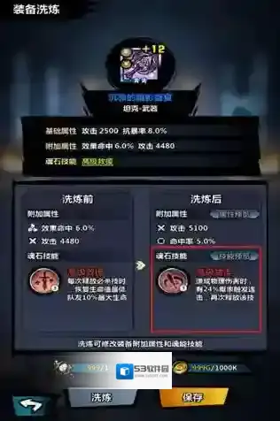 3、如果对获取的装备技能不满意,可以使用洗练功能对装备技能进行重置,重置范围固定在装备原来给出6个初始技能之间随机选择,洗练需要消耗洗练石与金币