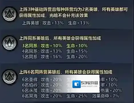 当上阵的英雄为同系英雄时,相同羁绊英雄之间将会获得额外属性加成效果。随着同系英雄的上阵人数增加,相关英雄所获得的羁绊属性加成也会随着提升。