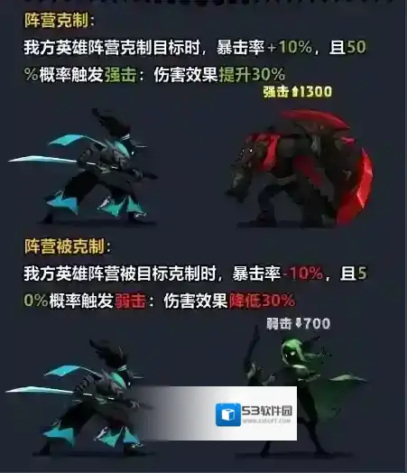 当我方英雄阵营克制目标时,将会提高暴击、触发强击以及提升伤害,反之,若被克制时,将会减少暴击、触发弱击以及降低伤害。