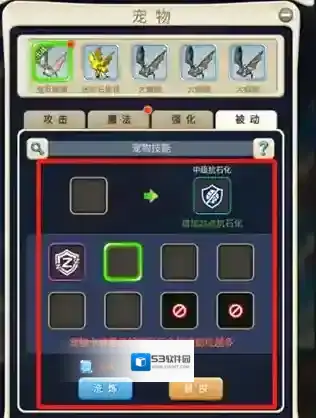 55月卡V1贵族:1/2级技能书在中后期非常便宜,有富余的钻石可以让主力宠物吃到2级。和满档光环一样,攻宠不用吃精神强化,魔宠不用吃物理系相关的强化(攻击、必杀、命中、反击)。