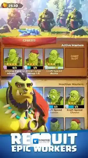 2、丰富的角色成长系统: 提升您的兽人团队, 学习新技能, 让他们在采矿之旅中变得更加强大。