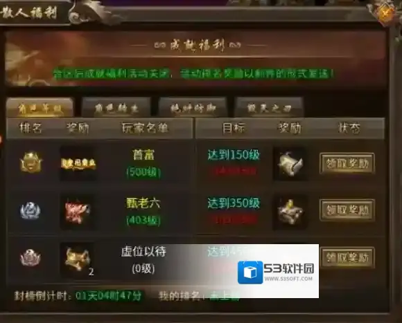 合区后成就福利活动关闭,活动排名奖励以邮件的形式发送!