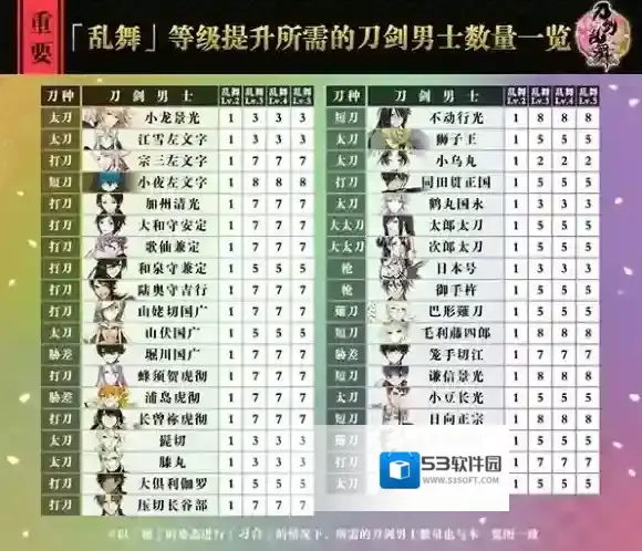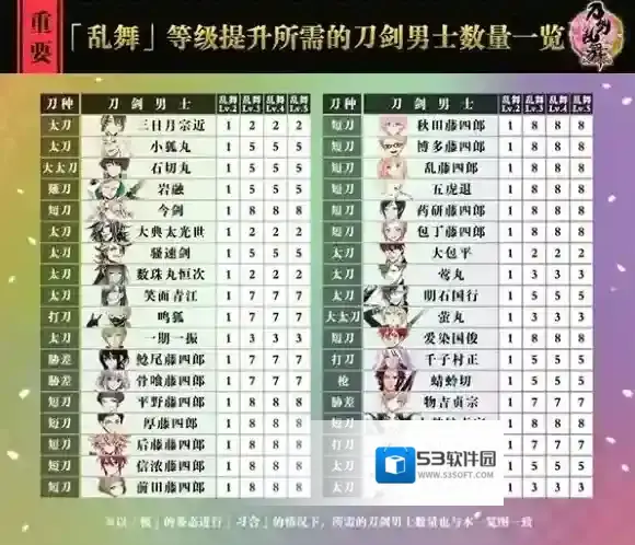 「乱舞」等级提升所需的刀剑男士数量