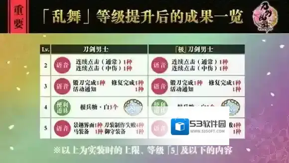 「乱舞」等级与现有的「刀剑」等级不同,是能够让刀剑男士通过「习合」来提升的另外一种等级系统。