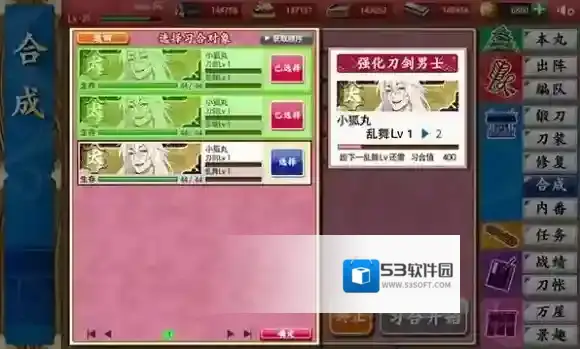 通过「习合」使用相同的刀剑男士来提升「乱舞」等级。