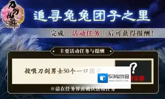 审神者在出阵时偶尔会发现兔子的踪迹,通过击败敌人、追寻兔兔或击破BOSS,有几率获得活动道具一口团子。对刀剑男士使用一口团子,能够大幅恢复一位刀剑男士的疲劳度,并听到全新的特别语音;完成活动任务对刀剑男士使用50个一口团子后,可以获得中秋特别景趣。