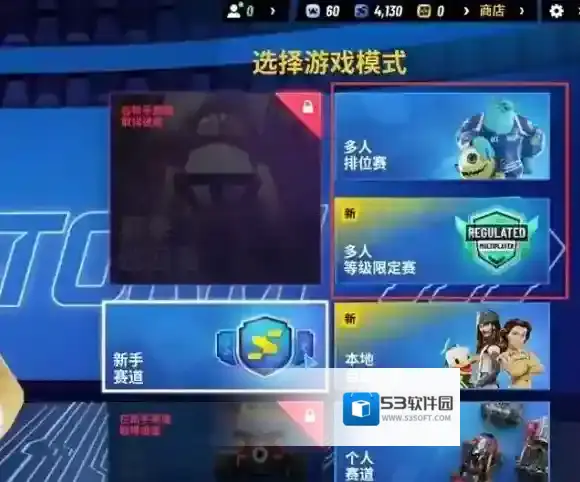 2、跳转至游戏模式选择界面,该界面提供多人排位赛、多人等级限定赛、本地自由比赛、个人赛道及新手赛道等多种模式选择,此处以新手赛道模式为例进行说明。