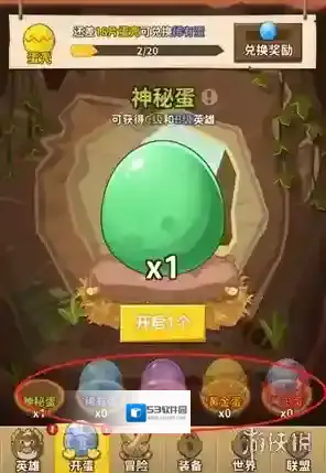 1、游戏里一个最直接的获取英雄的方法就是开蛋,蛋的品质有神秘、稀有、魔法、黄金、神王这几个品质。