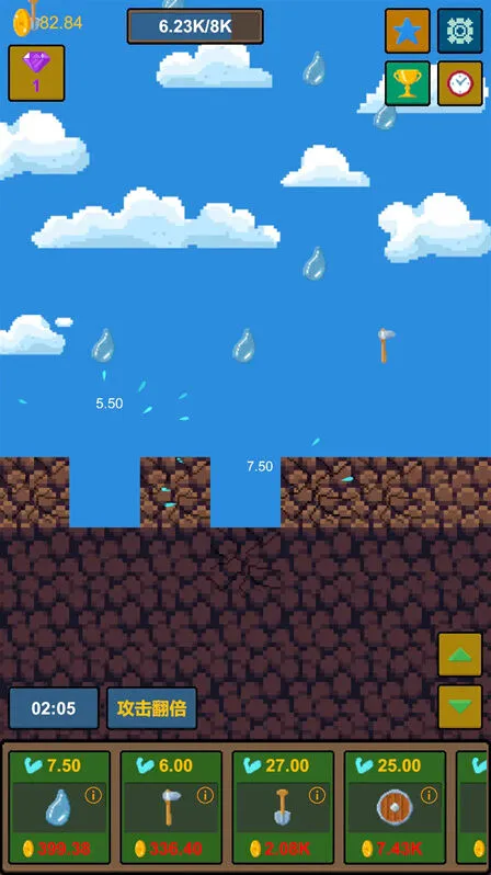 水滴石穿游戏是一款采用了放置挂机玩法模式的休闲单机游戏,你将通过操控水滴滴落到地面砸穿障碍物来积累金币。水滴石穿游戏里你收集的金币可用于购买各类强化道具,比如锤子、铁镐、盾牌等等,可以提升你攻击的冲击力还能解锁各种特殊能力,加速岩石的破坏进程。水滴石穿游戏虽然是像素画风但有一种特别的复古感,玩起来很是上瘾。