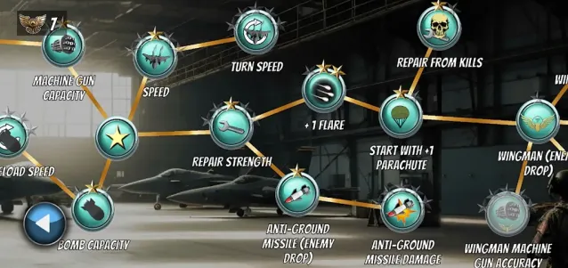 进入升级界面,可以使用金币提升炸弹伤害、机枪威力、火箭攻击、装甲防御及磁铁收集能力,增强战机战斗力以应对后续挑战。