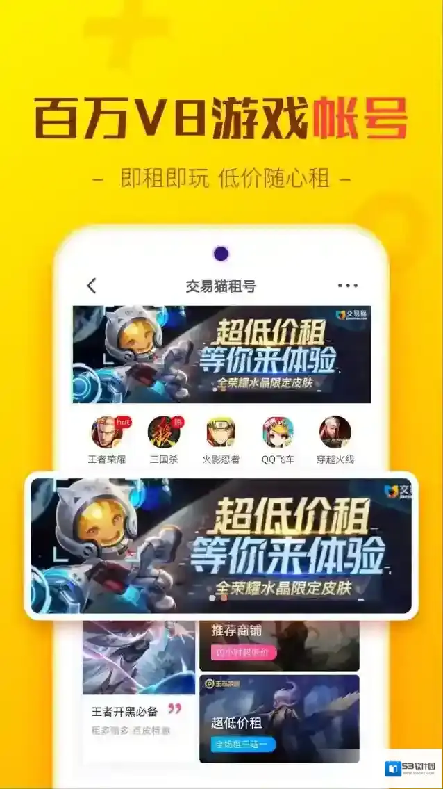 交易猫app是一款大型的手游交易平台应用,为大家提供上千款热门手游的账号,金币,道具,充值等各项服务,并且手续费全免,闪电发货,安全可靠,是各位手游玩家淘首充号,充值手游,购买道具的必备应用