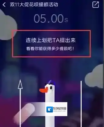 4,这个游戏的游戏规则就是用力把这个戴着帽子的小鹅给提出来,成功的话就能获得一定的花呗额度,当然这个有几率,也会有不成功的时候哦,共有10次提额机会,每轮有5秒的时间。