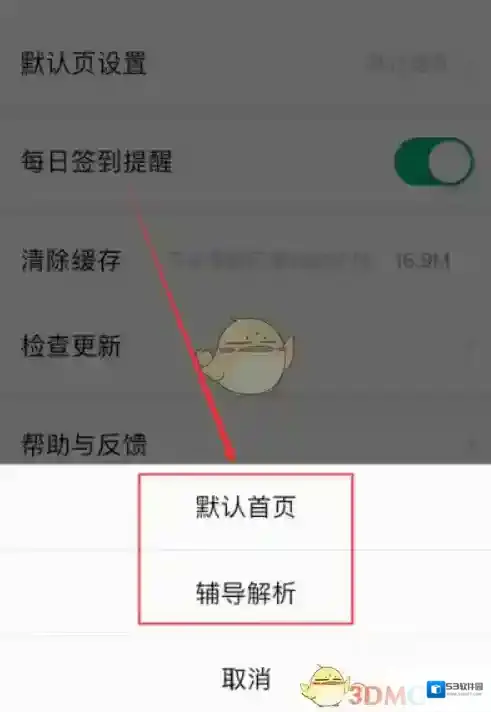 3、最后在弹窗中选择软件打开的默认页,如默认首页、辅导解析。