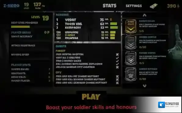 1、点击PLAY,进入全球排名对战,操控“Z-HERO”,在“Top Ranking”竞争,用武器、策略,击败僵尸,提升段位。