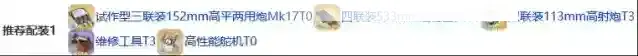 推荐理由:本质是个高防空的大型炮驱。在科技与猫能提供较多炮击值时130mm单装炮T3可选。防空炮使用同期推出的134高炮最佳,若没有可以用113。非承伤位也可以带金雷达增加对空能力。