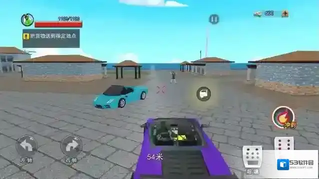 2、驾驶紫色汽车,按箭头指引前往指定地点,注意避让,准时送达货物。