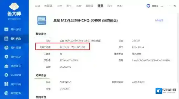 2.进入到电脑的主硬盘参数页面,可以看到有基础信息区域、拓展信息、实时信息等内容,在基础信息里就能够清楚的看到我们的磁盘已使用次数以及累计使用的小时数。