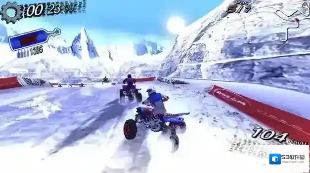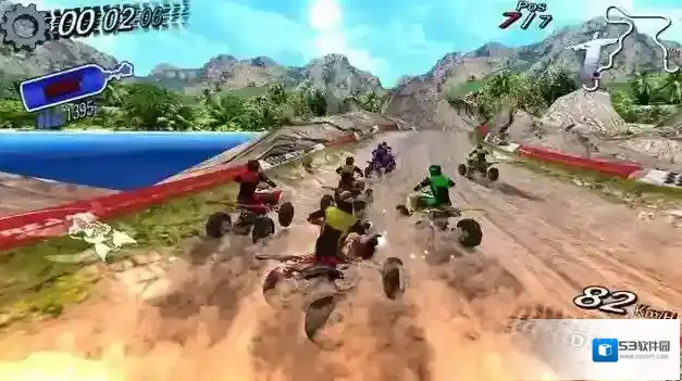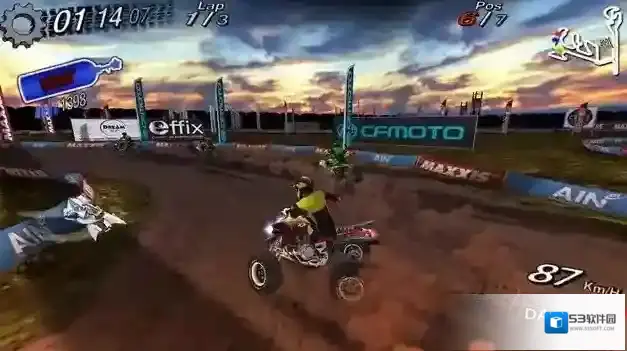 2、在“CAREER”模式,驾驶蓝白ATV,沿越野赛道,避障碍、超对手,积累比赛经验。