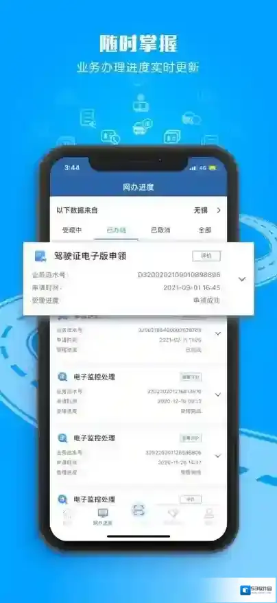这里会列出你所有正在办理或已完成的业务进度,涵盖预约考试、证件领取等。