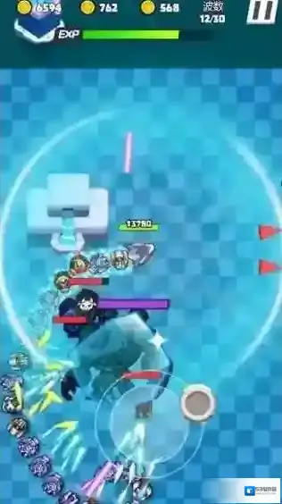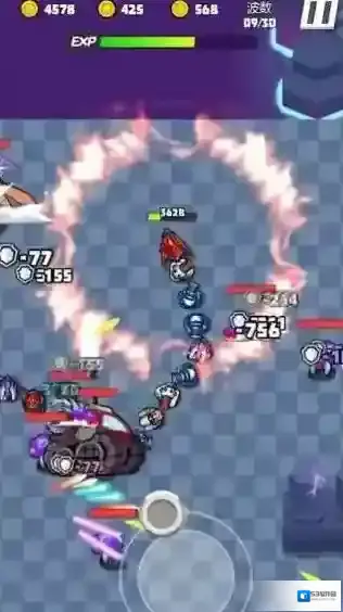 1、画面有“使用摇杆来移动”操作提示,显示经验(EXP)、金币等资源,还有波次(1/10)等信息。