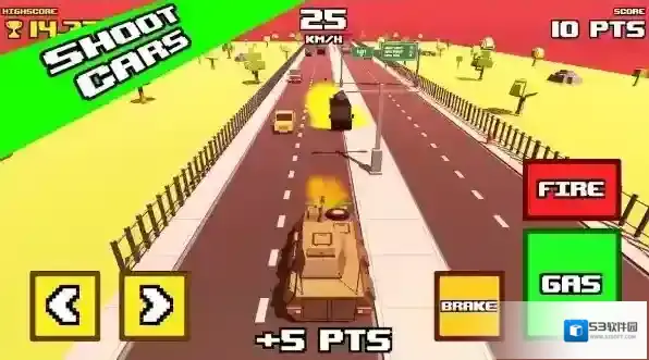 2、在公路场景操控坦克,利用左右箭头按钮转向,“GAS”键加速、“BRAKE”键减速,“FIRE”键射击,需在限时(00:35)内摧毁指定数量车辆(0/5)。