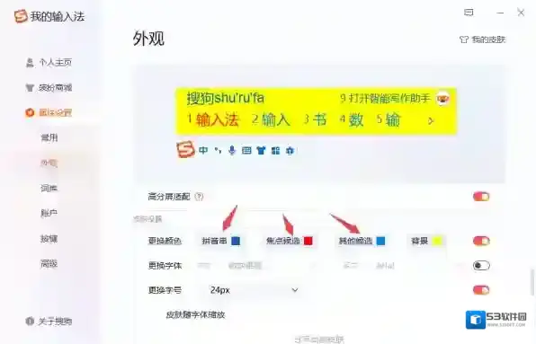 ⑤当然了,在这里,我们还可以对搜狗输入法的拼音串、焦点候选、其他候选的颜色进行更改。
