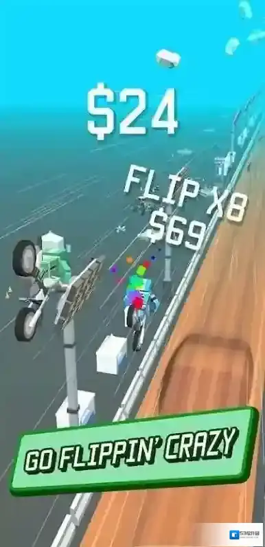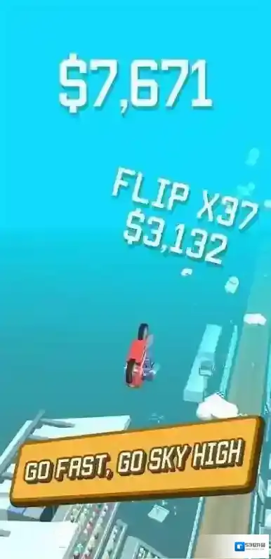 3、竞速中遇到“HOLD TO FLIP!”标识,长按触发空翻特技,在空中翻转时,调整长按时长、时机,精准落地保持速度,利用特技跨越障碍、拉开差距,在完成特技的同时冲刺终点。