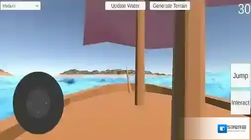 1、界面上有“Reflections”、“UpdateWater”、“GenerateTerrain”等调试按钮,还有“Jump”、“Interact”(交互)操作按钮。