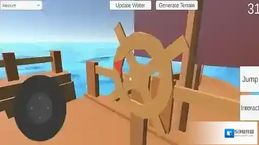 3、界面有许多调试按钮,还有“Jump”(跳跃)、“Interact”(交互)操作按钮,场景呈现海洋及船只甲板。