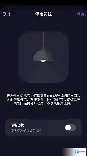 开启停电勿扰后, 灯具需要在5s内连续通断电两次才能正常开启。在停电后, 这个功能可以使灯具在来电时保持关灯状态,不惊扰用户休息。