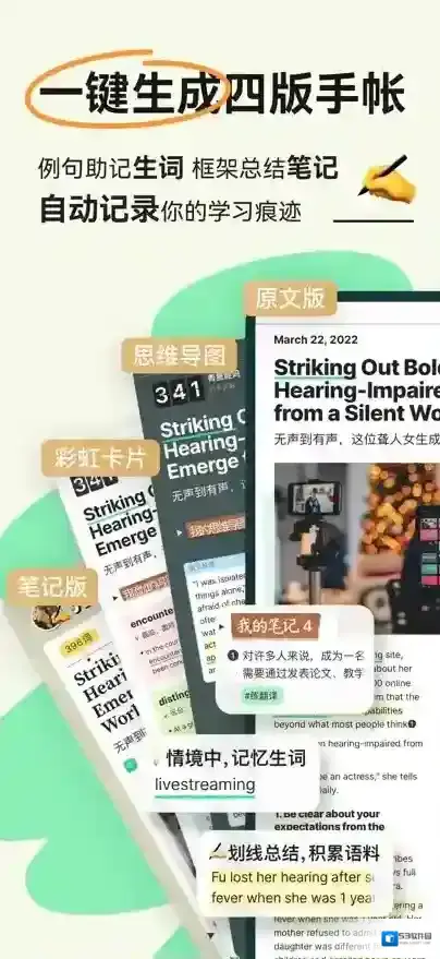 1、阅读过程中的每个生词都可以即时添加到自己的学习计划中,利用扇贝强大的记忆系统进行学习。