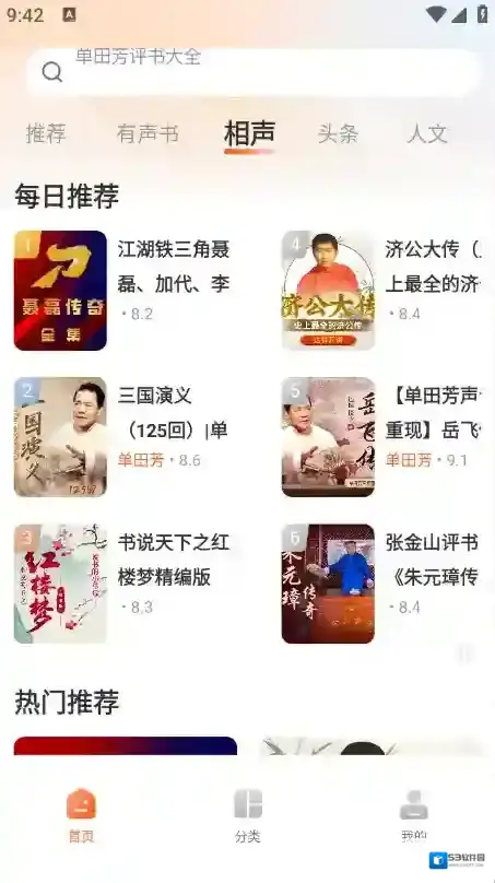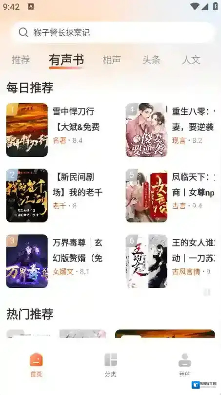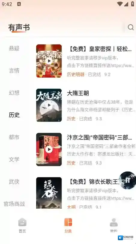 3、分类页面将有声书进行了详细的归类,都市、武侠以及历史等类型都有。
