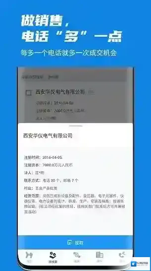 –销售的时间是要用来成交的。帮助销售人员快速的获取到客源,打破销售困境,增加自己的收益;每个用户都可以查看到客户的详细信息,包括了公司的企业名称、注册资本、企业法人、联系方式等等,用户能在线获取到重要资讯,提供针对性的销售服务。