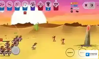 2、本关只要坚持四分半就可以结束,开局先一直召唤矿工和剑士,然后优先让矿工采集金块,当对面来进攻时就全体回撤,让城堡弓箭手来解决对手。