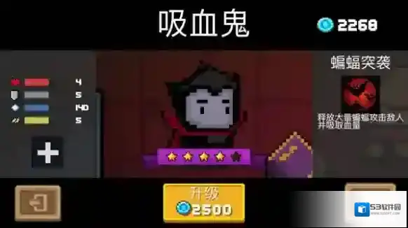 技能1:蝙蝠突袭:释放大量蝙蝠攻击敌人并吸取生命值。满级后蝙蝠数量提升。(血量满时蝙蝠吸取能量)
