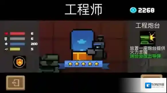 技能1:工程炮台:放置一座炮台提供火力支援。满级后炮台能放出导弹。