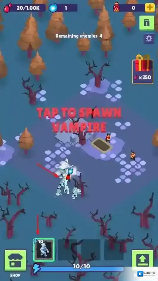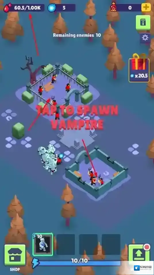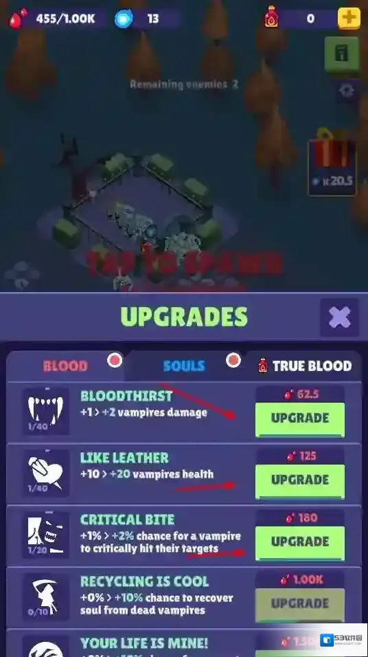 1、点击“TAP TO SPAWN VAMPIRE”,消耗资源召唤吸血鬼单位,投入战场对抗敌人,是基础战斗操作。