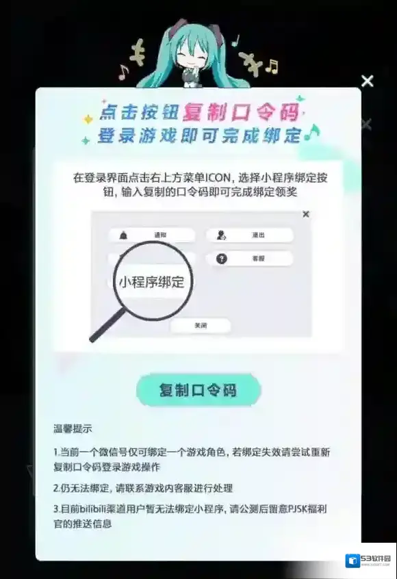 5、请点击小程序绑定,将已复制的口令码粘贴绑定操作即可。
