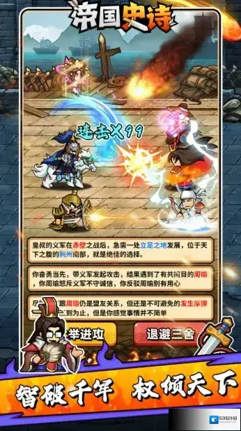 帝国史诗,以三国背景为题材的文字冒险类肉鸽RPG手游。我们将会来到热血的三国时代,在这里开启你的霸业之旅!无需什么复杂的操作,轻松点击推剧情,过五关斩六将,享受畅快杀敌的爽快玩法!在闯关过程中可以自由的去搭配自己的技能组合,每一局的选择都可能不相同,策略性十足,更多丰富多样的玩法模式任你选择,让你畅享酣畅淋漓的战斗盛宴!