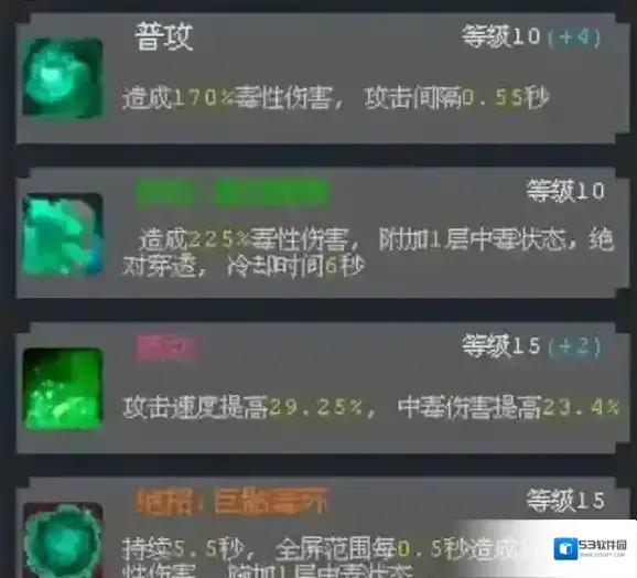 技能提升中毒层数,被动技能优先升级以提升中毒伤害。