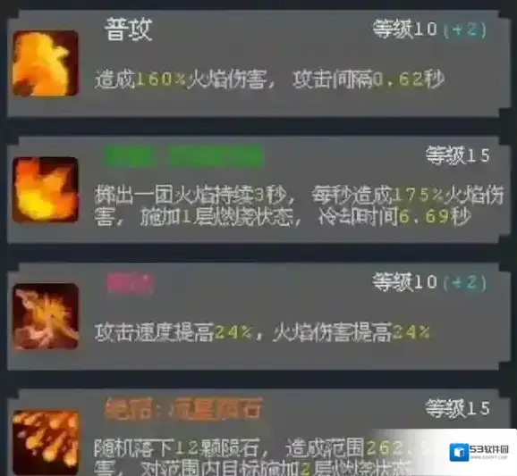 被动技能优先升级以提升火焰伤害,普攻保持适中以节省资源。