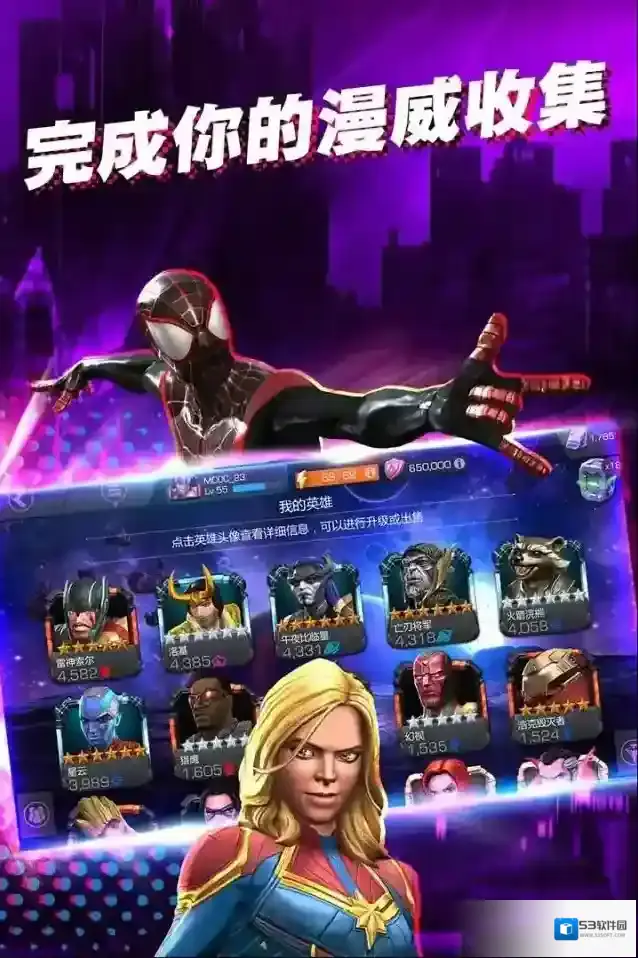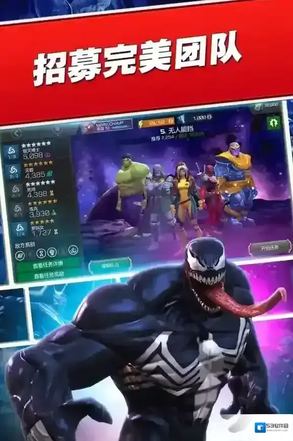1、收集,升级,并根据漫威漫画情节中的人物关系,妥善地安排队伍中的英雄和反派成员来获得队友加成,越强力的英雄,他们的属性数值、能力以及特殊动作就越强。